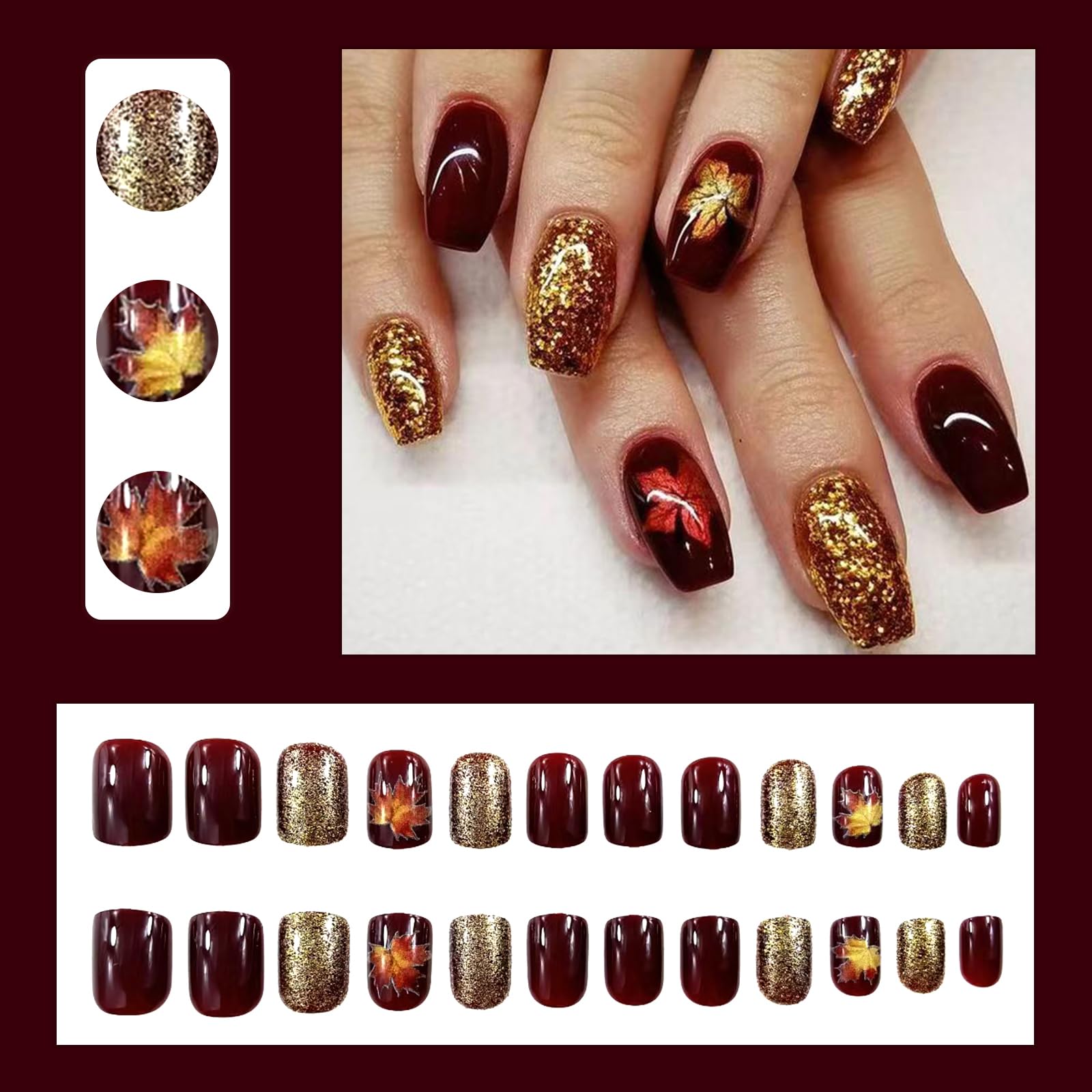 24Pcs Fall Press on Nails Short Square Fake Nails Wine Red and Gold Maple Leaf Glossy Gold Sparkly Acrylic Nails Full Cover Stick on Nails Autumn Thanksgiving Nail Decoration for Nail Art Supplies