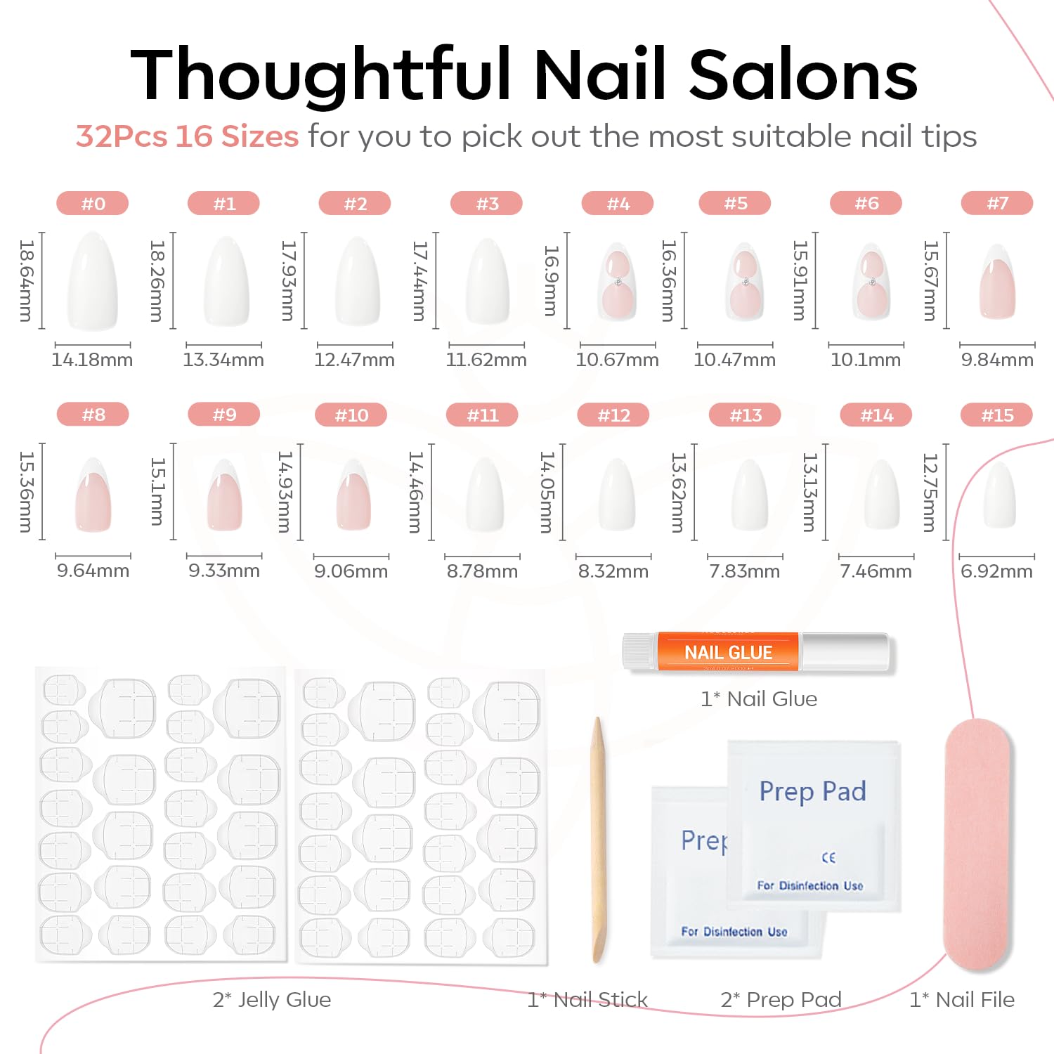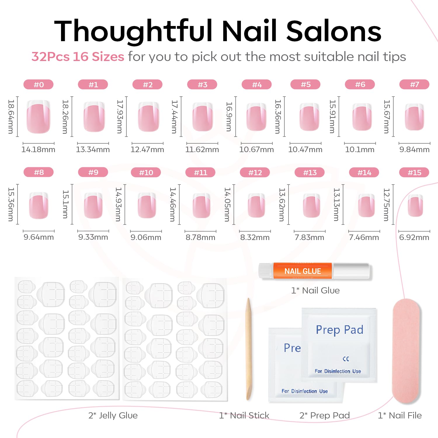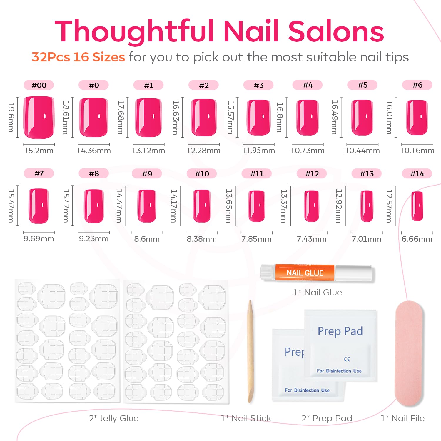 - 32 pcs Nails in 16 Sizes: The press on nails kit comes with 32pcs fake nails in 16 different sizes to suit each finger, each set comes complete with a nail glue, 2 sheets jelly adhesive tabs, double-sided nail file, cuticle stick, and prep pad